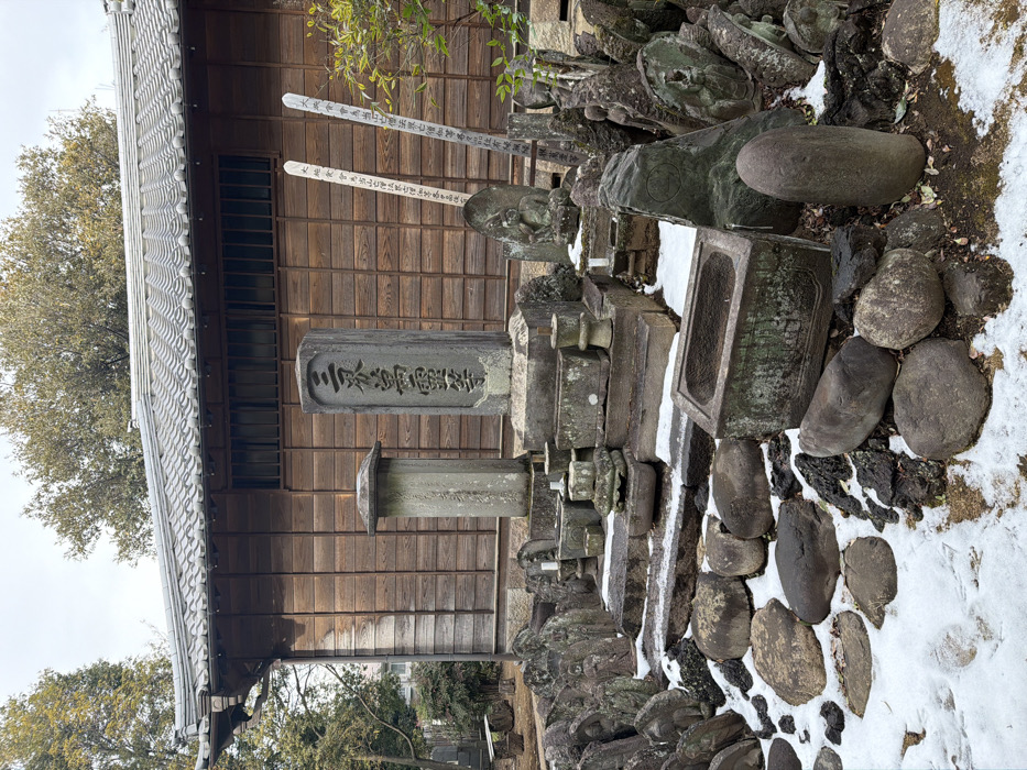 A solemn Japanese temple scene, showing weathered wooden architecture. Rows of stone graves, some inscribed with text, line the building. Moss and patches of snow adorn the graves, contributing to an aged aesthetic. The atmosphere is peaceful, suggesting a place of historical or spiritual significance.