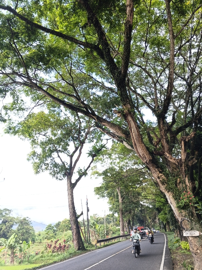 A road stretches through a lush, green landscape. Tall trees line both sides of the road, their branches forming a natural canopy overhead. Motorbikes travel on the road. A field with assorted plants and trees lies beside the road on one side, with a distant mountain range visible. Overhead wires and utility poles are also present. The scene suggests a tropical or subtropical environment.