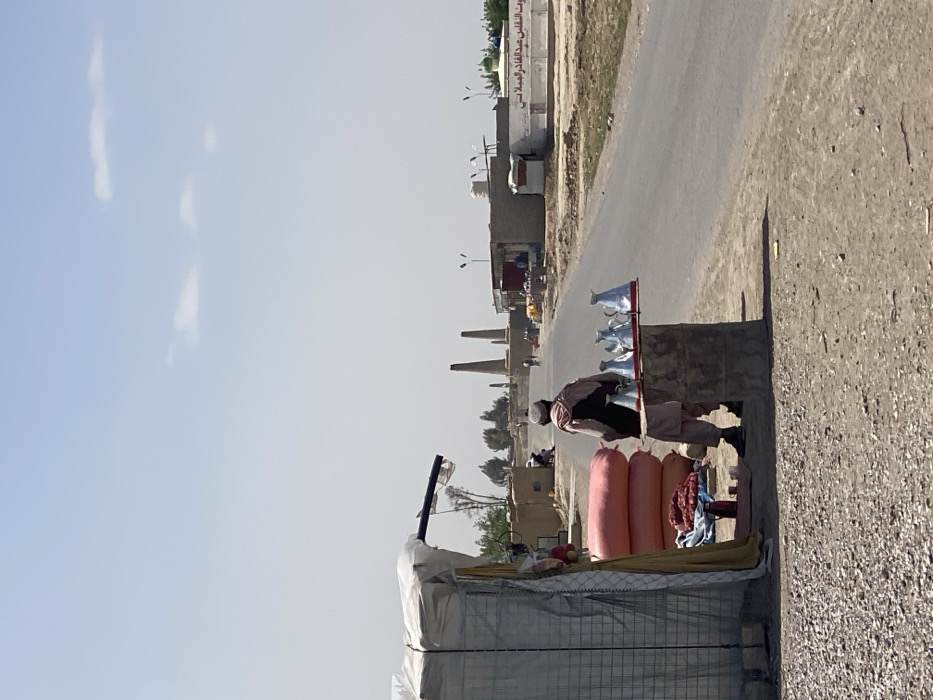 An outdoor scene in Nakhonay, Afghanistan, depicts a roadside market under a clear, hazy blue sky with sparse clouds