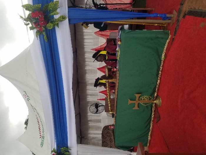 The scene depicts a formal outdoor event held under a white marquee tent in Alor, Nigeria