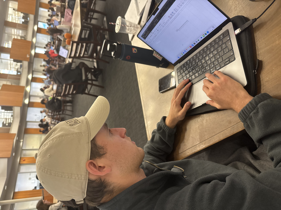 The image depicts a crowded study area within the Arthur W. Diamond Law Library at Columbia University in New York City, United States. The space features a multi-tiered, open-concept design with numerous tables and chairs occupied by individuals. In the foreground, a young adult male, seen from the right side in profile, is seated at a light-colored wooden table. He wears a beige baseball cap with dark lettering, a dark grey quarter-zip fleece, and grey sweatpants. His attention is directed downwards towards a silver laptop resting on a black padded sleeve. His hands are positioned over the keyboard and trackpad, indicating active use. A black smartphone lies face down to the left of the laptop. A dark blue water bottle with stickers, a clear plastic cup with a straw, and a spiral-bound notebook are also visible on the table to the right of his laptop. The background reveals a large, well-lit academic environment. Multiple wooden tables with chairs are arranged throughout, predominantly occupied by students engaged with laptops or books. The architecture includes circular elements, light-colored walls, and a visible upper level with additional study spaces. Overhead lighting fixtures are present. Two small orange decorative pumpkins are visible on a distant table, suggesting an autumn timeframe. The floor is covered with dark carpeting.
