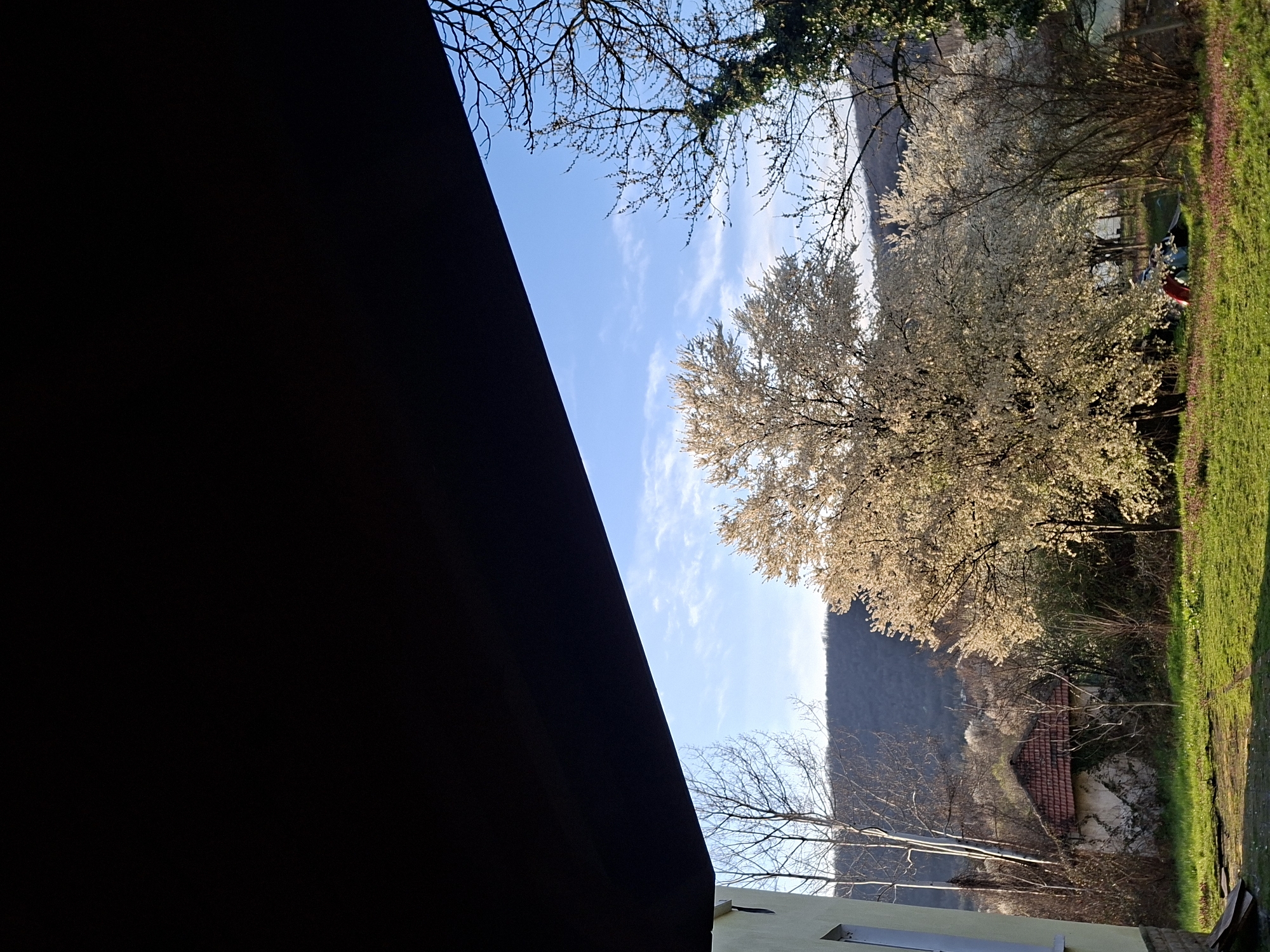 The image depicts an outdoor scene in Rebarkovo, Bulgaria. A dark, angled surface occupies the left side of the frame. To the right, the sky is visible with scattered clouds and bare tree branches. A flowering tree stands prominently in the middle ground, with a hillside visible in the background. Green grass covers part of the lower right area. A red-roofed building is seen amid other vegetation, partially obscured by trees. In the lower left, part of a building exterior is also visible.