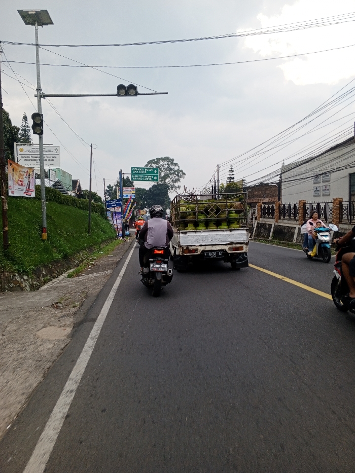 This image captures a street scene in Kheda, India, under an overcast sky. The view is from a low perspective, appearing to be from a moving vehicle. The asphalt road features a solid white line delineating the shoulder on the left and a dashed yellow line marking a lane divider further right. On the left, a grassy slope rises from the roadside, bordered by a concrete curb. A tall metallic pole stands prominently, supporting a solar panel at its peak. Below the solar panel, two sets of traffic lights are mounted: one vertical unit on the pole and a horizontal unit on an arm extending over the road. Several banners, one white with text and illustrations, and another with "SELAMAT HARI RAYA IDUL FITRI" are affixed to the pole and fencing along the slope. Further down the road on the left, a green road sign with white text indicates directions to locations such as "CIPANAS / BOGOR" and "JAKAIA". In the foreground and midground, traffic moves along the road. A male motorcyclist, wearing a helmet and a light-colored vest, rides a dark motorcycle, with a visible license plate "F 3108 QAQ". Ahead of this motorcycle is a white, weathered pickup truck with a rusted bed, laden with numerous stacked green gas cylinders secured by a metal frame. The truck's rear license plate displays "F 8436 WT". On the right side of the road, a concrete barrier topped with decorative black metal fencing lines the roadside. Beyond this, a building with a tiled roof is visible. A light blue scooter with a female driver and a child passenger is also in motion on the right lane. The front wheel and lower section of a third motorcycle, white and red, are partially visible on the far right. Numerous utility lines are strung across the sky above the road.
