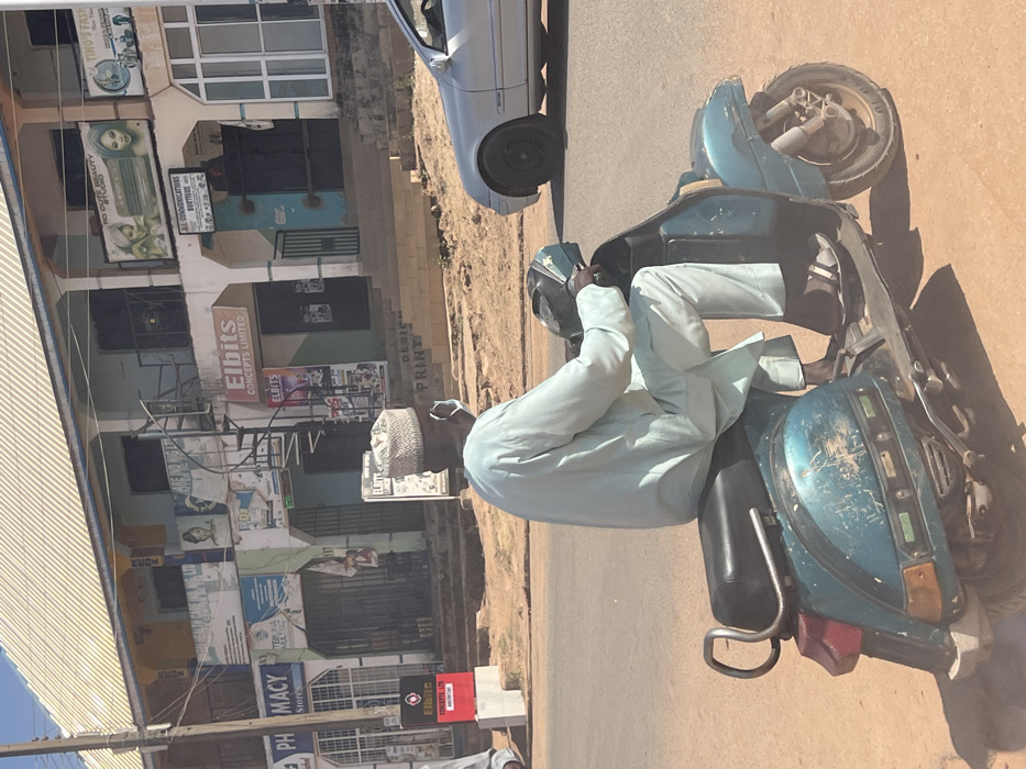 - "An adult male, wearing a light mint-green tunic and trousers, a white patterned kufi cap, and a light blue disposable face mask, is seated on a teal-blue vintage-style scooter" by FM-y0awH3, licensed under CC BY 4.0