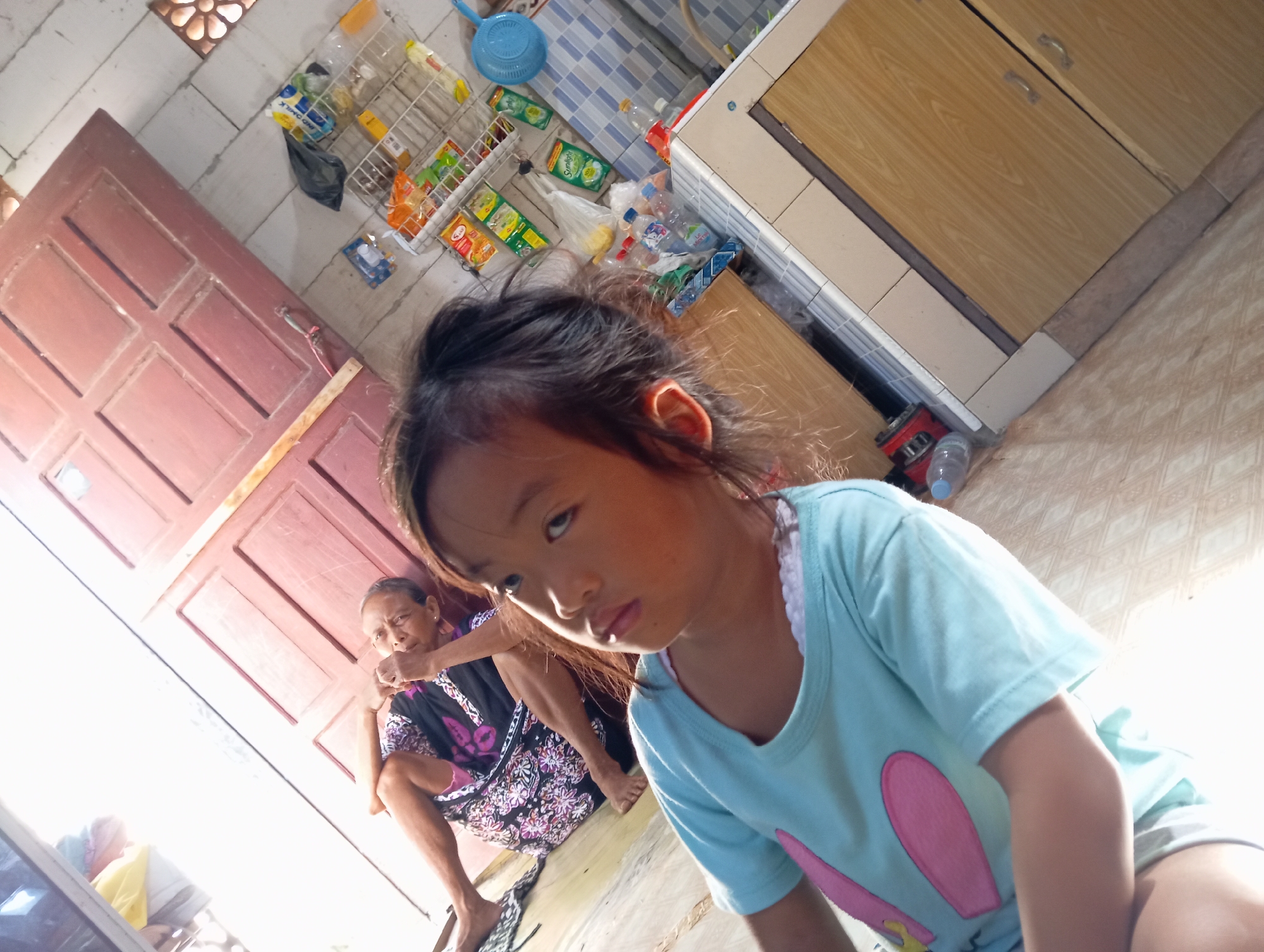 A young Asian girl in a blue shirt with pink bunny ears is in the foreground. Behind her, an older Asian woman wearing a floral print dress is squatting. They are inside a house in the city of Baron, Indonesia. The room has light brown walls, and a brown wooden door is visible on the left. There is a white tile wall with some items stored on it, including packaged goods and a blue wash basin. A wooden cabinet is situated on the right. The floor is covered with light brown patterned tiles.