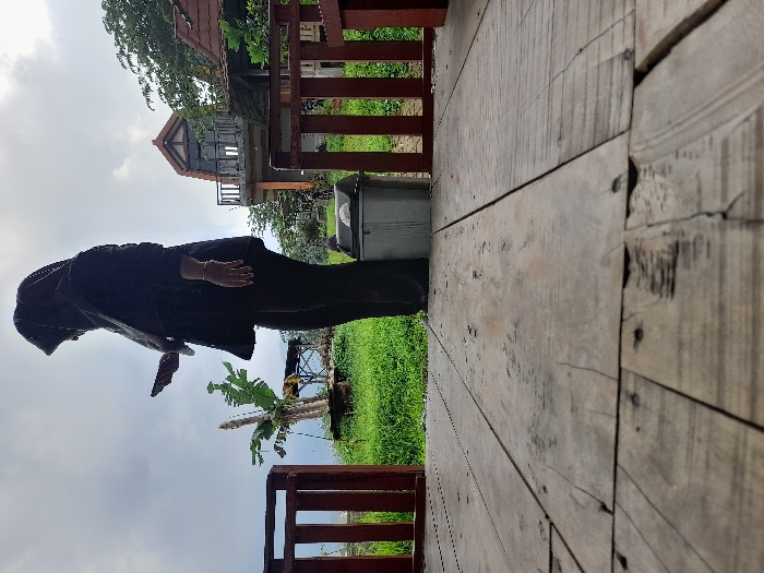 The image displays an outdoor scene in Penanggungan, Indonesia, under an overcast sky. A single individual, seen in profile from the waist down, stands facing left in the midground, dressed in a dark long-sleeved top, dark trousers, and a dark hijab. This person holds a dark-colored smartphone in their right hand, seemingly engaging with the device. A light-colored bracelet is visible on their left wrist. To the immediate right of the individual stands a grey cylindrical plastic trash bin with a black lid. The foreground is dominated by a weathered wooden deck composed of horizontal planks. Reddish-brown wooden railings are present on both the left and right sides, partially framing the scene. In the background, beyond the individual and railings, is a landscape of green grass and foliage. A banana plant is visible to the far left. Further into the distance, a light-colored building with a dark, distinctive peaked roof and an upper-level balcony is positioned, accompanied by a partial view of an adjacent structure to its right. The sky is predominantly cloudy with areas of brighter light.