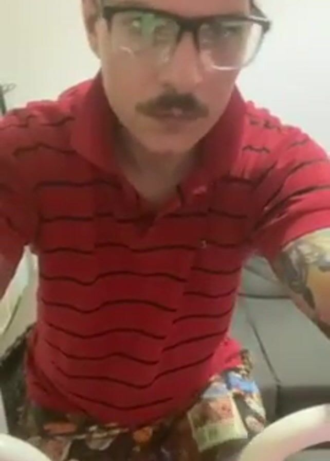person from the chest down. They are wearing glasses, a red polo shirt with thin black stripes, and cartoon-printed boxer shorts. The person has dark hair and a mustache. Their left arm is heavily tattooed. The person is holding onto the white handles of an exercise machine. The background is a plain wall, and a grey couch is partially visible.