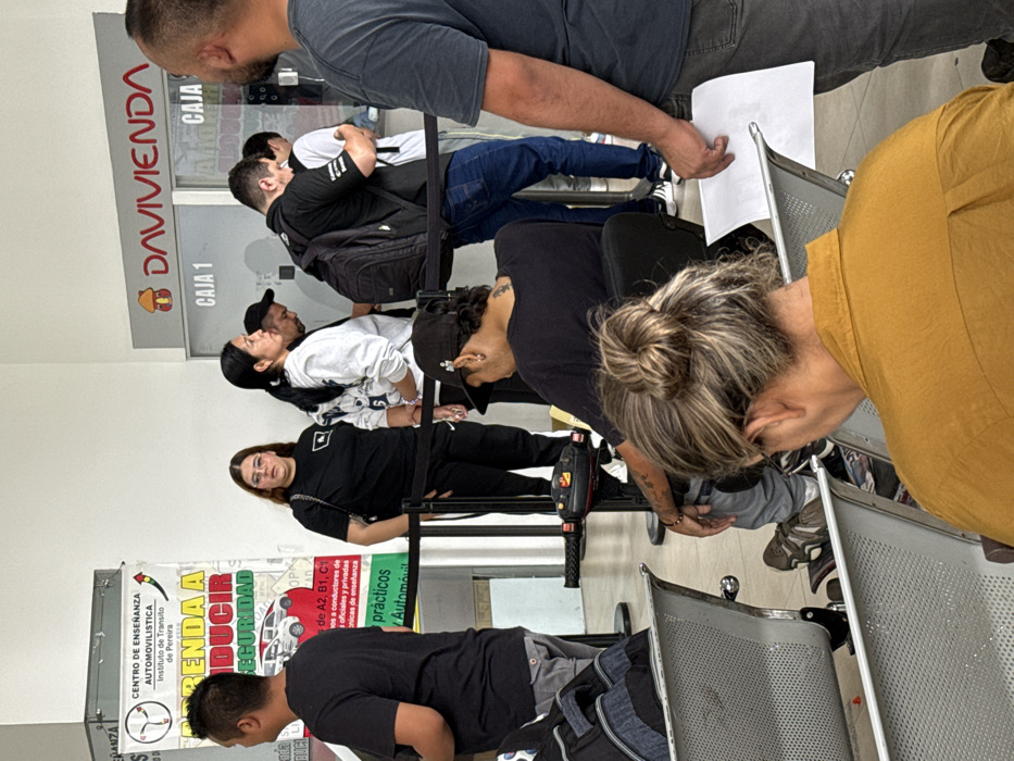 The scene depicts an indoor public service area in Perimetro Urbano Pereira, Colombia, characterized by light-colored tiled flooring and white walls. Visible signage includes a banner for "CENTRO DE ENSEÑANZA AUTOMOVILISTICA Instituto de Transito de Pereira" on the left and a "DAVIVIENDA CAJA 1" bank service counter on the right. Eight individuals are present. In the immediate foreground, a woman with light brown hair styled in a messy bun, wearing a mustard-yellow collared shirt, is seated on a metallic waiting chair, looking downwards. To her right, a man with short dark hair, wearing a grey t-shirt and darker pants, stands, holding a white sheet of paper in his left hand. Behind them, a man with dark hair and a black baseball cap worn backward is seated on a black motorized scooter, exhibiting tattoos on his right forearm and a dark mark or tattoo on the back of his neck. Further back, a queue is formed by five individuals delineated by black retractable belt barriers, awaiting service at the Davivienda counter. From left to right within the queue: a man in a black t-shirt and grey pants, facing left; a woman with reddish-brown hair and glasses, wearing a black t-shirt with a white logo; a woman with long dark hair in a ponytail, wearing a light grey patterned hooded sweatshirt; a man in a black t-shirt with white arm stripes, blue jeans, and a black backpack, leaning towards the counter; and a partially visible person in a white shirt behind him. The man in the far right foreground, with short dark hair, is observing the counter area. All individuals appear to be engaged in waiting or conducting transactions.