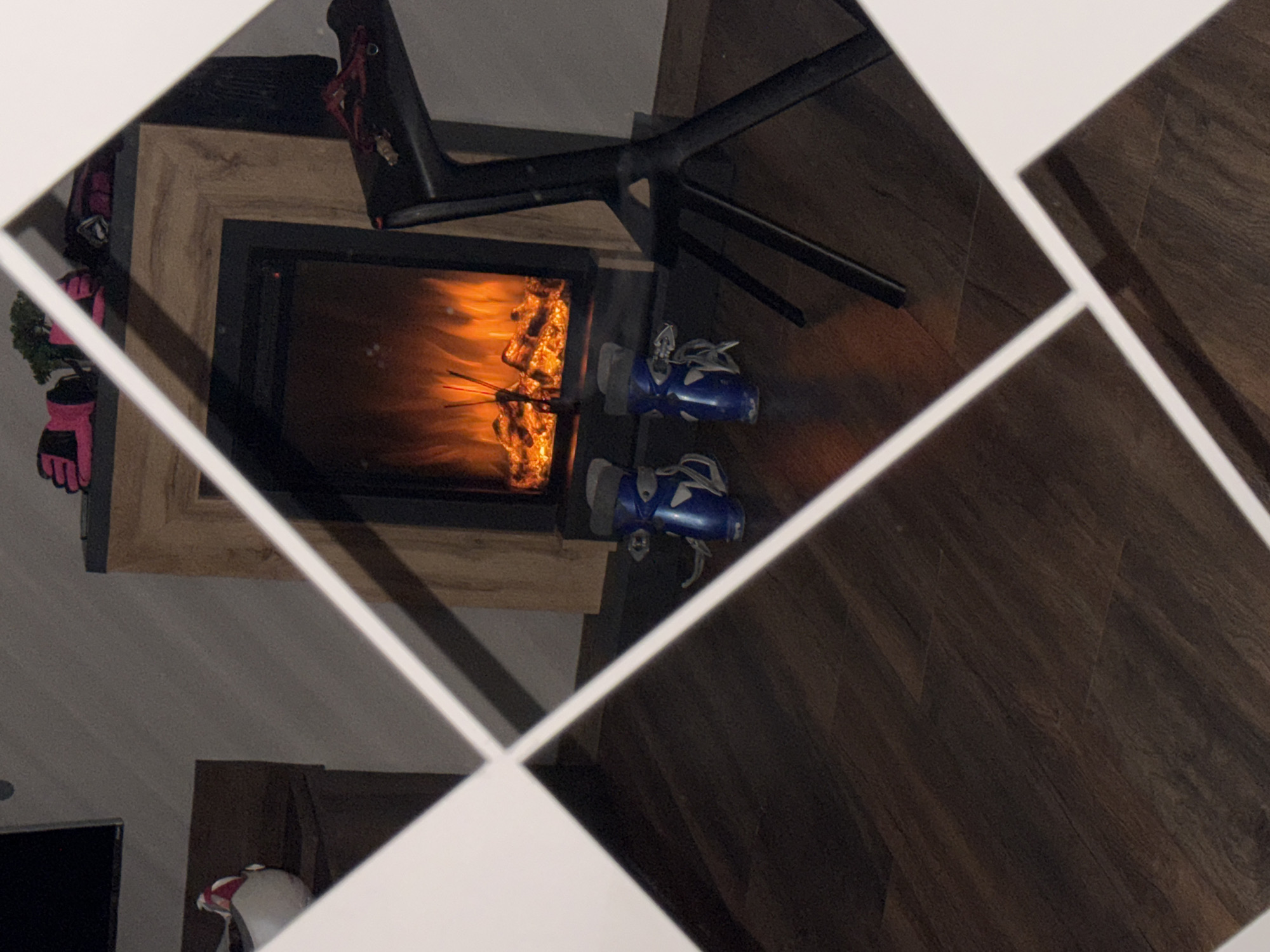 The scene depicts an interior room in Samokov, Bulgaria, partially obscured by a white geometric overlay suggesting a reflective surface or decorative element. The primary focal point is an illuminated electric fireplace with a realistic artificial fire display, featuring glowing logs and simulated flames. The fireplace has a light-colored wooden surround and a dark interior frame. In front of the fireplace, two blue ski boots are positioned on a dark wooden laminate floor, facing the warmth. On the mantelpiece above the fireplace, a pair of pink ski gloves, a small green artificial plant, and other dark fabric items are present. To the right of the fireplace, a black bar stool or high chair is partially visible, with a red strap or accessory resting on its seat. In the background to the left, a dark flat-screen television is mounted on a light gray wall, with a wooden cabinet below it. A white object, possibly a ski helmet with red accents, sits on the cabinet. The room is dimly lit, with the fireplace providing the dominant light source. No individuals are present, and no active interactions or movements are depicted.