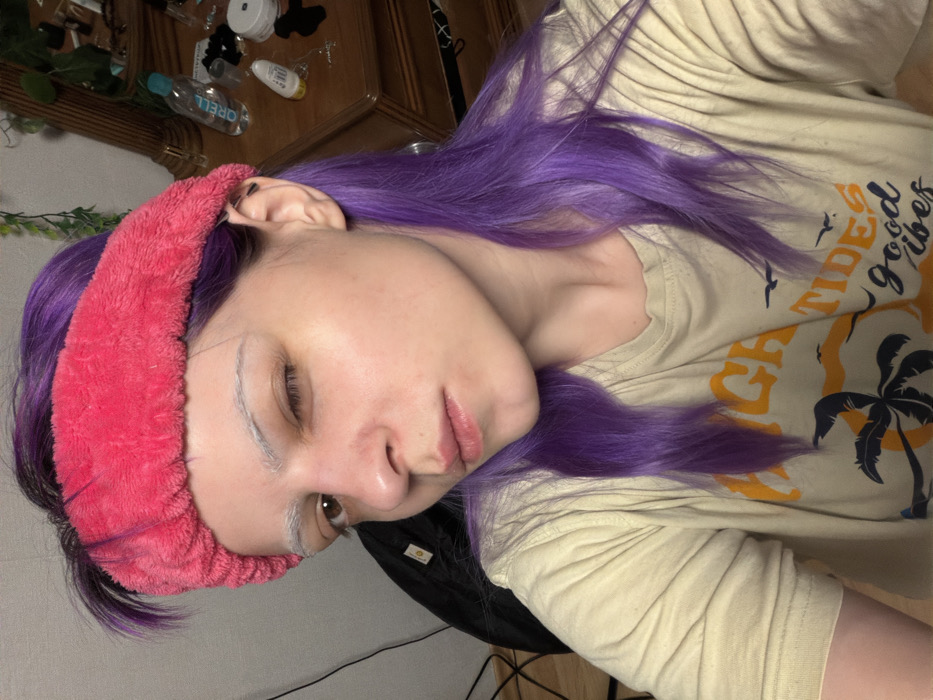 An indoor photograph features a female subject in Sof'ino, Russia, depicted from the chest up. She has bright purple hair with darker roots and is wearing a fuzzy, bright pink headband that pushes her hair back. Her eyebrows are very light, appearing white or light grey. The subject is looking towards the viewer, winking with her left eye (viewer's left) while her right eye remains open. Her lips are slightly pursed. She is wearing a light beige short-sleeved t-shirt with a graphic design featuring palm trees, birds, and the text "HIGH TIDES good vibes". In the background to her right, a wooden dresser or cabinet holds various items, including a clear bottle with a blue cap (labeled "ORELL"), a small white tube, a white circular container, and several black hair ties. A green plant hangs down in the upper right corner of the frame. To her left, a dark object and a black electrical cable are partially visible.