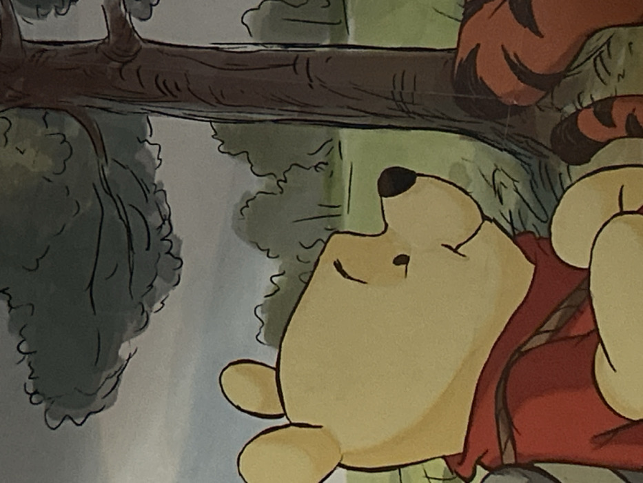 The scene depicted in this illustration is located in the city of Silistra, Bulgaria. The image shows a cartoon rendering of Winnie the Pooh in the foreground, presented in profile, facing right with a slight smile. He is yellow, wearing a red shirt, with his hands positioned near his midsection. To his right, partially obscured by a prominent brown tree trunk, are the orange and black striped leg and tail of Tigger. The background consists of green ground, various green trees and bushes, and a light blue-grey sky with a darker grey mass in the upper left, consistent with dense foliage or clouds.