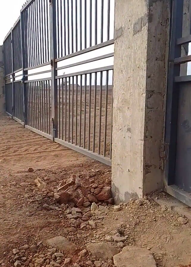 horizontal metal structure with thin bars on top of a concrete beam. The ground next to the beam is dirt and small rocks. The video then pans up to show a wide, dirt field with a tall concrete wall lined with palm trees in the distance. The sky is overcast.