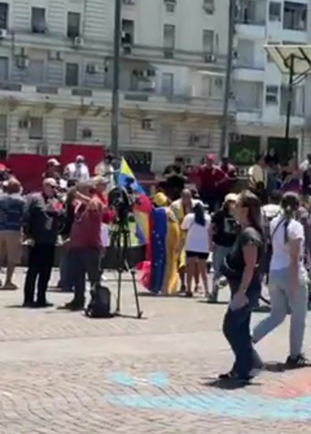 gathering of people in a public square. The ground is paved with patterned tiles. A person dressed in a full-body suit with the colors of the Venezuelan flag is standing among the crowd. Several people are holding Venezuelan flags. A camera is set up on a tripod. Some people are wearing red shirts. Buildings surround the square. People are walking around.
