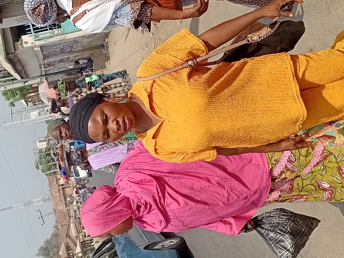 Several people are walking outside on a sunny day. One woman in the foreground wears a black head covering, an orange top, and yellow pants. Another woman wears a pink head covering and pink top. A third wears a white head covering and top with patterned brown fabric. The street shows a mix of pedestrians, vendors, and vehicles. Buildings and power lines are visible in the background under a clear sky.