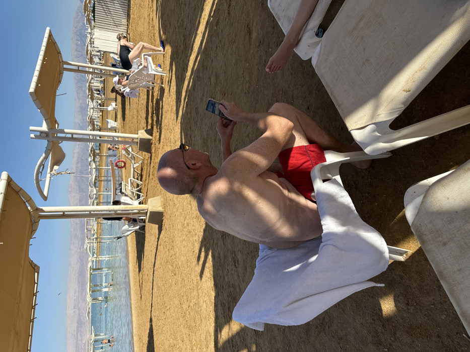 A bright, sunny beach scene is depicted at the Dead Sea, located in the Tamar Regional Council, Israel. In the mid-foreground, a balding, light-skinned male with a beard, wearing red swim trunks and sunglasses, is seated on a white plastic chair. A white towel is draped over the back of his chair. He holds a silver smartphone in both hands, actively engaging with it while looking down. To the immediate left and right of the main subject, parts of beige-colored beach lounge chairs are visible, one in the lower left and another in the lower right, displaying a bare human foot and lower leg. The sandy ground is light brown, marked with distinct shadows cast by overhead structures. The background reveals a large expanse of the Dead Sea, characterized by its unique blue-green water, where several individuals are visible, some standing, some floating or swimming. The shoreline is dotted with numerous white plastic chairs and beige lounge chairs, many positioned under white-framed structures supporting beige fabric canopies that provide shade. A red lifebuoy rests on the sand near the water's edge. Further to the right in the mid-ground, a person in a black swimsuit is observed bending over near a white chair. In the far distance, across the water, arid, light-colored mountains rise under a clear, brilliant blue sky.
