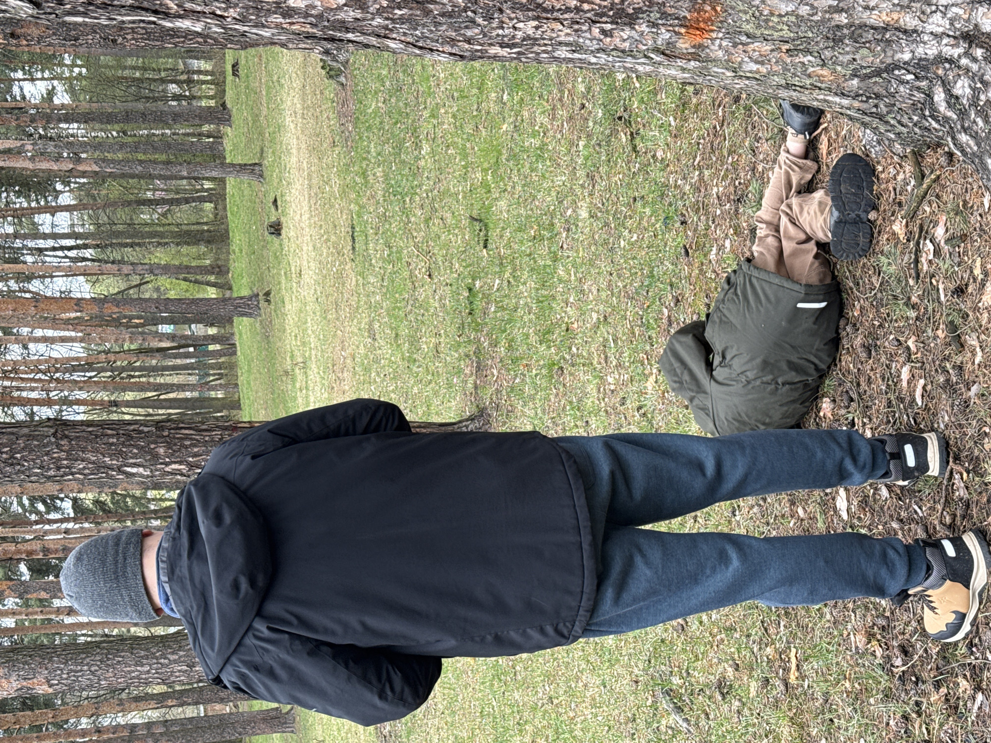 A photograph taken in a forest in Dmitrov, Russia, depicts two individuals near a tree. One person is lying on the ground near the base of the tree, clad in a green jacket, brown pants, and black shoes. The other person stands, facing away from the camera, wearing a black jacket, dark blue pants, a gray beanie, and multicolored shoes. The ground is covered with grass and leaf litter. Trees dominate the background.