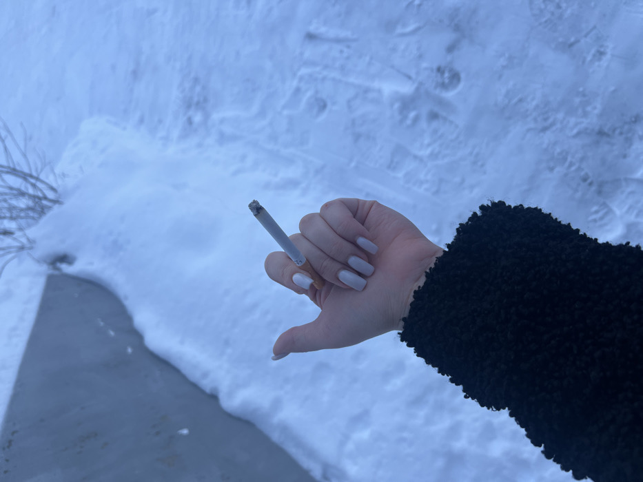 A close-up view depicts a human left hand holding a lit cigarette between the index and middle fingers. The hand has light-toned skin, and its fingernails are painted a light grey, squared off at the tips. The wrist and lower forearm are covered by a black, textured material, consistent with a winter garment sleeve. The cigarette is white with a tan filter, and its tip shows a conical ash accumulation, indicating it is actively lit. The background consists of a deeply snow-covered landscape, exhibiting both undisturbed snow and areas with faint impressions, possibly footprints. In the upper left, a segment of a grey concrete wall or structure, partially covered by snow, is visible. Sparse, thin, dark branches of a small plant or shrub emerge from the snowdrift in the upper right. The scene is illuminated by cool, diffused daylight, characteristic of winter conditions in Tromsø, Norway.