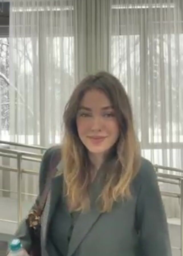 A young woman standing inside a building with large windows behind her, presents herself to the camera. She wears a gray blazer, a matching top, and black pants. A brown shoulder bag is slung over her left shoulder. She holds a plastic water bottle in her left hand, then moves the bag and bottle as she turns slightly to her right. The windows behind her are covered with sheer white curtains, and snow is visible outside. A metal handrail is on the right side of the frame, suggesting a ramp or staircase.