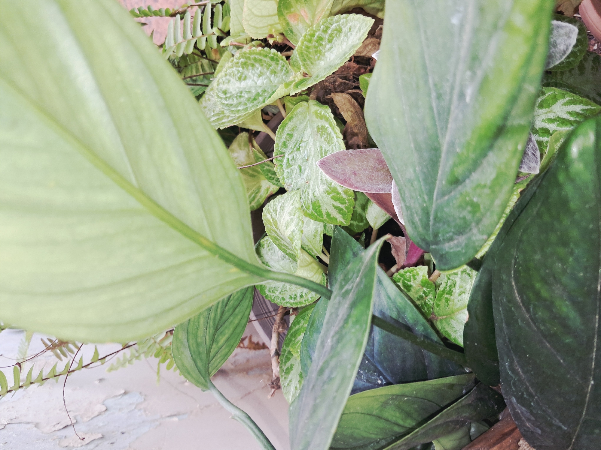 close-up of several houseplants with different types of leaves. There's a large, light-green leaf obscuring part of the view on the left, a fern with small leaflets, and plants with textured, green and white patterned leaves. There are also dark green, smooth leaves in the lower right. The plants appear to be in a pot or container situated indoors based on the presence of a wall in the background. There are no people visible, and the location in Juan Griego, Venezuela cannot be determined from the visual content.