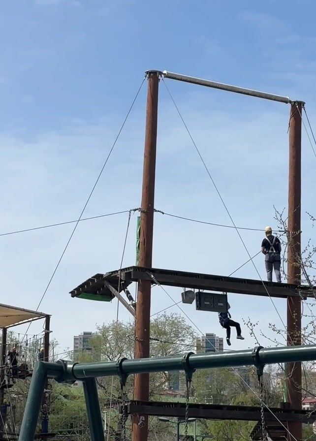n outdoor obstacle course on a partly cloudy day. Two wooden platforms are connected by a zipline cable. A person wearing a yellow hard hat and dark clothing stands on the first platform. Another person, also wearing a yellow hard hat, is seated on the zipline, partway between the platforms. They are connected to the line by a harness. Another obstacle course structure is visible on the left side of the frame. A person is walking across a raised platform on that structure. There are green trees and buildings in the background. A green metal structure runs along the bottom of the frame, slightly obscuring the lower parts of the other structures.