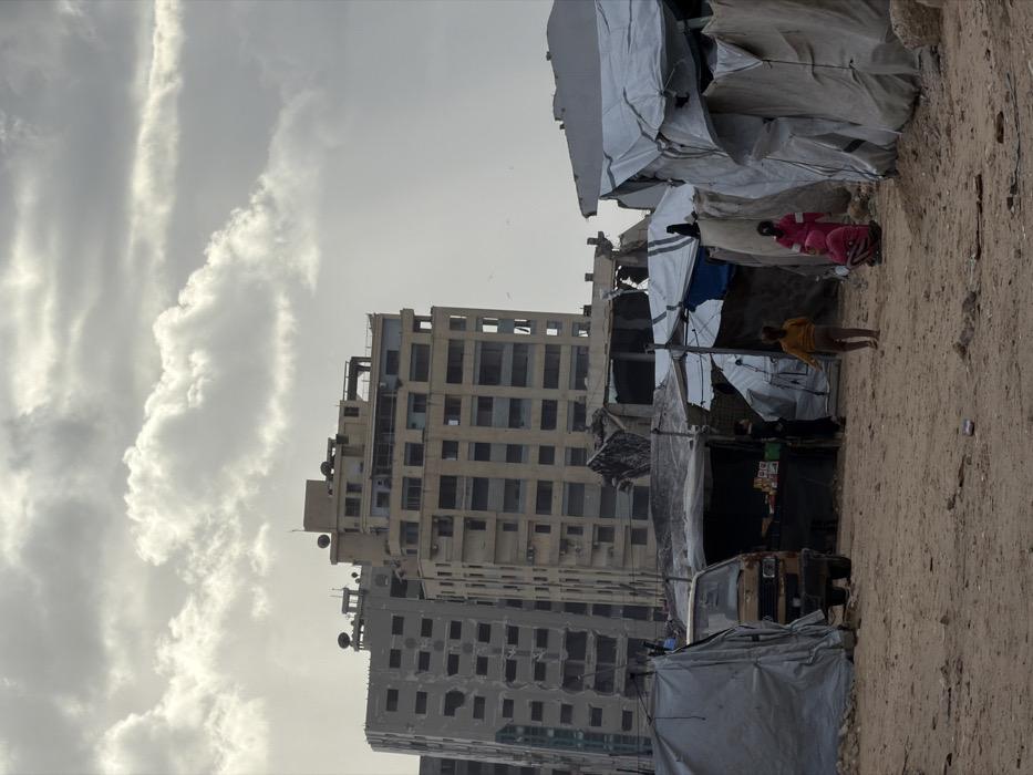 - "The image displays an outdoor scene in the city of Gaza, Palestinian Territory, characterized by a makeshift encampment situated in front of damaged high-rise buildings under a cloudy sky" by FM-PSI0J3, licensed under CC BY 4.0