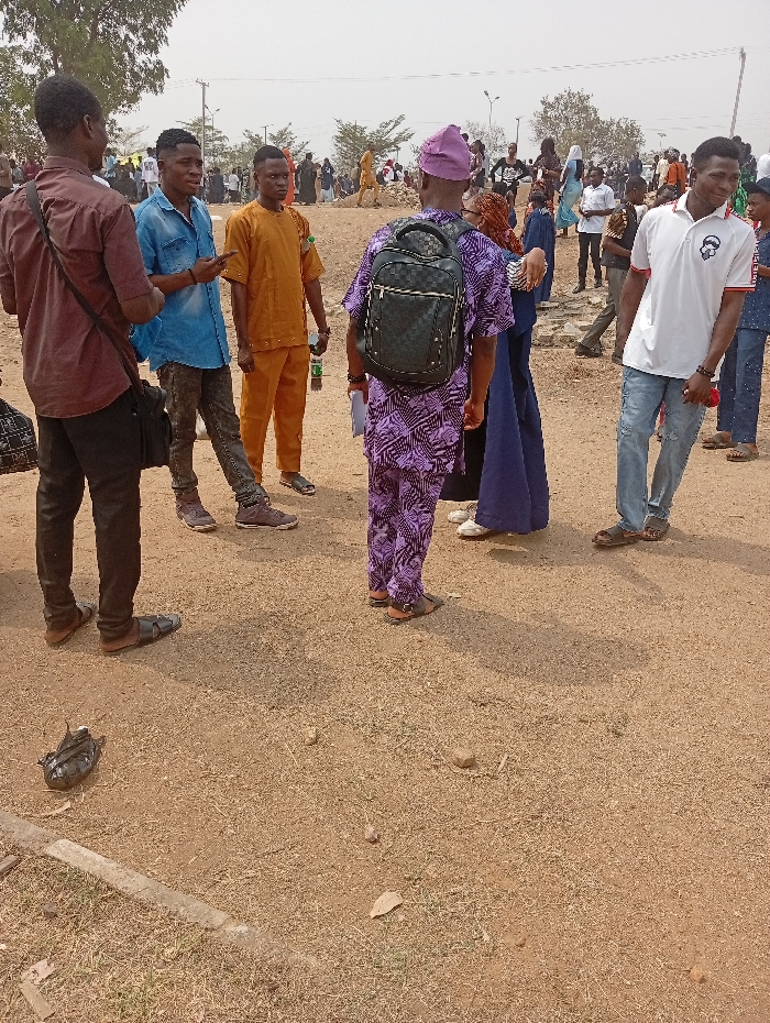 The image captures an outdoor gathering in Adankolo, Nigeria, under a bright, hazy sky