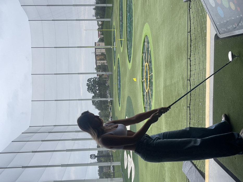 A female individual is depicted in profile, positioned within a golf bay at a Topgolf facility in Oxon Hill, Maryland, United States