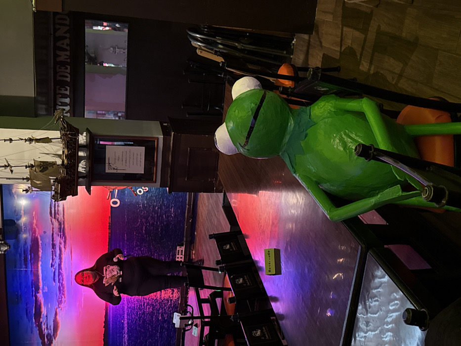 The image depicts an indoor scene within a restaurant or event space in Mexico City, Mexico. In the mid-ground, a female with dark hair, wearing a dark long-sleeved shirt with a light-colored animal graphic and dark pants, stands on a stage or raised platform, gesturing with both hands. Behind her, a large illuminated mural portrays a sunset over water, displaying gradients from red to purple. To the right of the female, a detailed wooden model of a sailing ship is prominently displayed atop a dark wooden pedestal which houses a framed document. In the foreground, a large, green, seated Kermit the Frog figure, constructed from paper-mâché or similar material, occupies a chair at a dark wooden table. A yellow "Reservado" sign is placed on this table. Surrounding tables are equipped with dark wooden chairs featuring "S. & C." logos on their backs. The environment is dimly lit, with purple and red stage lighting illuminating the tables and the speaker, casting reflections on the polished surfaces. A partial sign displaying "NTE DE MAND" is visible in the upper right background.