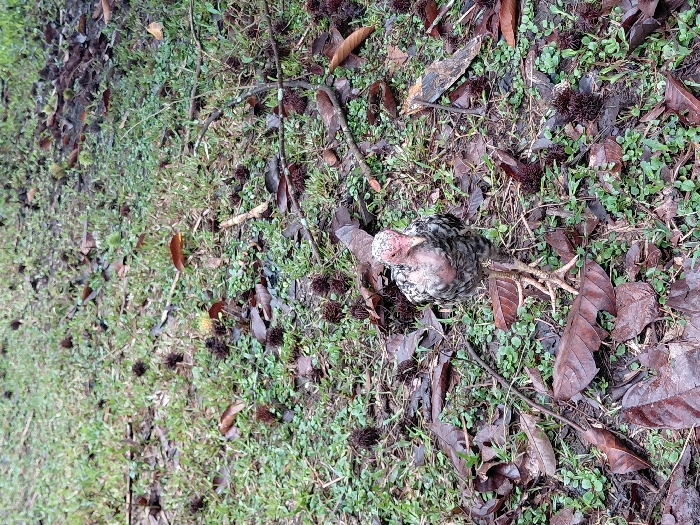 A small, mottled chicken rests on the ground amidst fallen leaves, spiky seed pods, and small green plants. The chicken has pink skin on its head and neck. Debris is scattered across the ground, including twigs and wet leaves. The ground appears damp, possibly after recent rain. The scene is lit with soft, diffuse light.