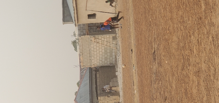 Two people are wrestling on a sandy plot next to a building under construction. One person wears an orange shirt, and the other wears blue. The building is made of cinder blocks and has a wooden ladder leaning against it. Another person is visible in the background, along with a second, smaller building with a corrugated metal roof. The sky is hazy. A football is on the ground.