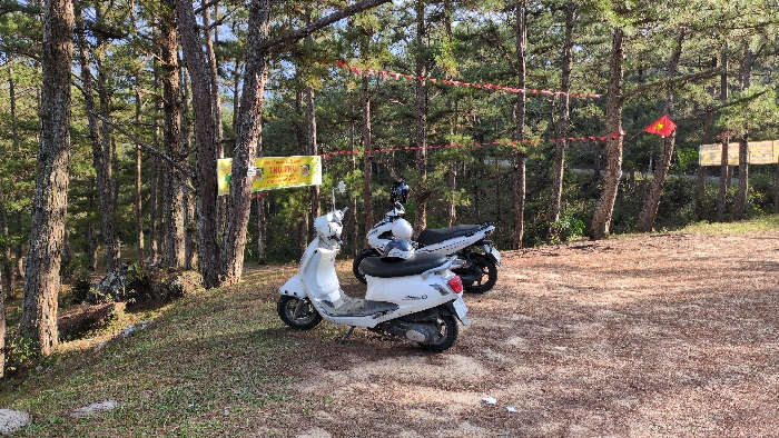 A wide shot depicts a forest clearing or roadside area in Lán Tranh, Vietnam, under natural daylight. Two motor scooters are parked on a dirt and sparse grass surface in the midground. The scooter on the left is white and appears smaller, facing towards the left. The scooter on the right is white and black, larger, and faces towards the right, with a white helmet resting on its seat. The background consists of a dense pine forest with numerous tall, slender tree trunks and green foliage. Horizontally strung between several trees are red ribbons or small red flags. Attached to these ribbons on the right side is a small red flag featuring a yellow star, resembling the national flag of Vietnam. To the left of the Vietnamese flag, a yellow banner with black Vietnamese text, including the phrase "THU THU," is tied between two trees. Further to the right in the background, behind the Vietnamese flag, several rectangular brown signs or plaques are affixed to tree trunks. In the lower left foreground, near the tree line, large rocks covered with green moss or foliage are visible. No individuals are present in the scene.