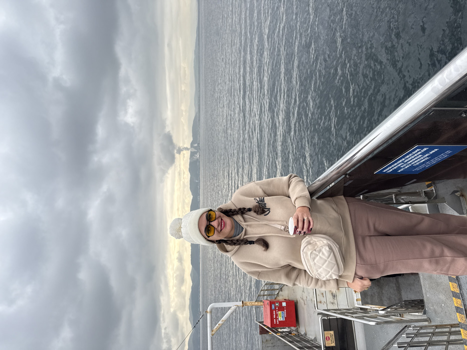 An adult female is depicted standing on the upper deck of a vessel, likely a ferry, on Izmit Bay, Kocaeli, Türkiye