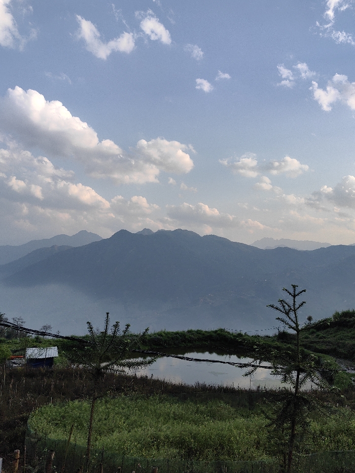 The image displays a mountainous landscape in Tả Van, Vietnam, under a partly cloudy, light blue sky. The foreground consists of a densely vegetated field of green plants, beyond which lies a small, irregularly shaped pond or reservoir reflecting the sky. Two slender, dark green, coniferous-type trees are visible, one prominently positioned on the right of the pond and a smaller one to the left. Dark horizontal wires traverse the midground above the pond. To the far left, a small, white-sided structure with a dark roof is partially visible near the pond's edge. The midground features a valley partially obscured by a light grey haze or fog. The background is dominated by multiple layers of mountains, appearing progressively bluer and less defined with distance. The sky above is clear blue, with scattered white cumulus clouds varying in size and density. No individuals, actions, or specific interactions are discernible within the frame.