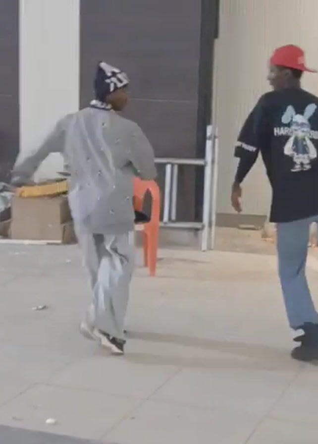 Two men are dancing in a sparsely decorated indoor space. The man on the left wears a gray tracksuit, a beanie hat, and a necklace. The man on the right wears a black t-shirt with a cartoon graphic, ripped blue jeans, a red baseball cap, and black shoes. They are facing the camera and moving their bodies to music. There is a chair, ladders, and boxes in the background. The floor is tiled.