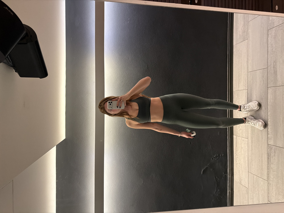 An adult female is depicted standing centrally, facing a full-length mirror, capturing her reflection with a white-cased smartphone held in her raised right hand. Her face is obscured by the phone. She has long, light brown hair and is wearing a dark green athletic two-piece set consisting of a sports bra and high-waisted leggings, paired with white athletic shoes. A ring is visible on her right ring finger, and a light-colored bracelet on her left wrist. She holds a small, white, unidentified object in her left hand. The setting is an interior space, likely a gym or modern changing room. The background wall is dark gray or black with a textured finish, featuring two prominent horizontal LED light strips that illuminate the space. The ceiling is light-colored, with a dark, possibly black, inverted U-shaped structure (consistent with a speaker or vent) mounted near the top right corner. The floor is composed of light gray, rectangular tiles. The right edge of the mirror reveals a vertical structure with horizontal slats, possibly a locker door or partition. There is no specific visual information within the image to definitively identify a location in the city of Milan, Italy.