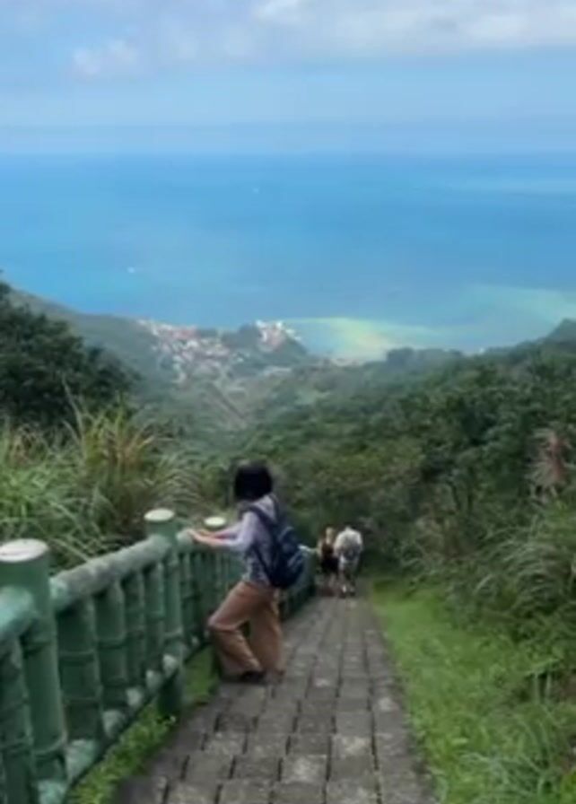 A medium, still shot depicts a partially obscured view of a young woman and others on a steep, stone staircase leading down a verdant hillside towards a distant coastal town and blue ocean. The woman, seen from behind, wears a light-colored long-sleeved shirt, brown pants, and a dark backpack, holding onto a light green, bamboo-like railing on the left. Two figures are further down the stairs, also descending. The staircase is constructed of gray stone blocks, with grass growing along its sides. Lush greenery covers the hillsides on either side of the stairs. In the distance, a town is nestled along the coast, bordering a vast blue ocean under a sky with scattered clouds. The overall light suggests a slightly overcast day.