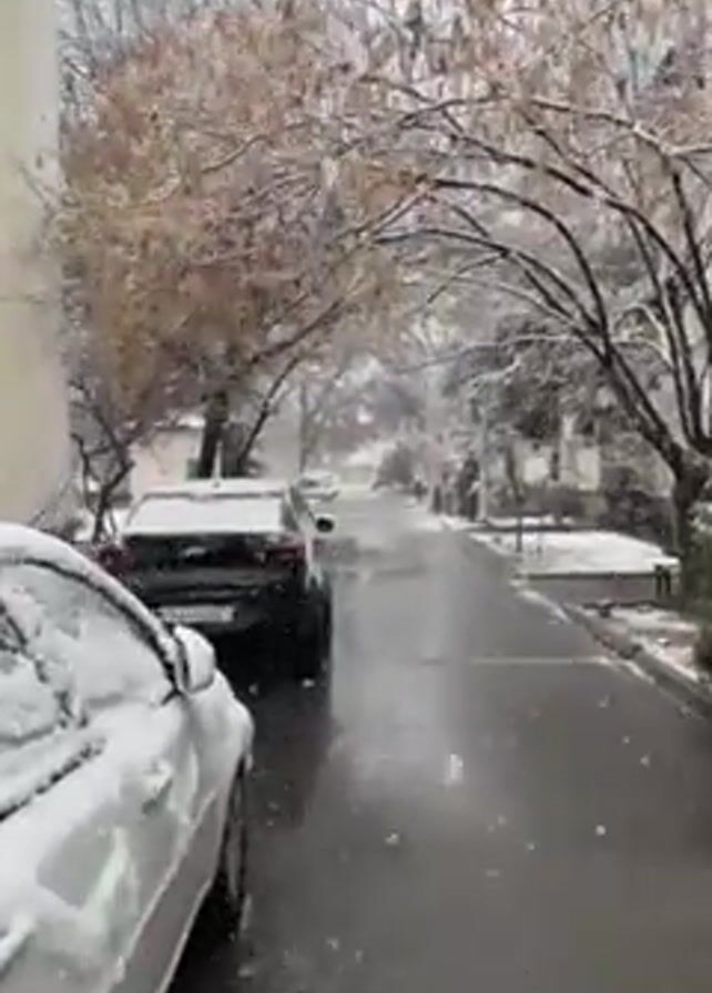 street in winter. Snow is falling. Cars parked on the side of the road are covered in snow. Trees line the street, their branches coated with snow. The street is wet from melting snow. The view is taken from ground level, moving forward.