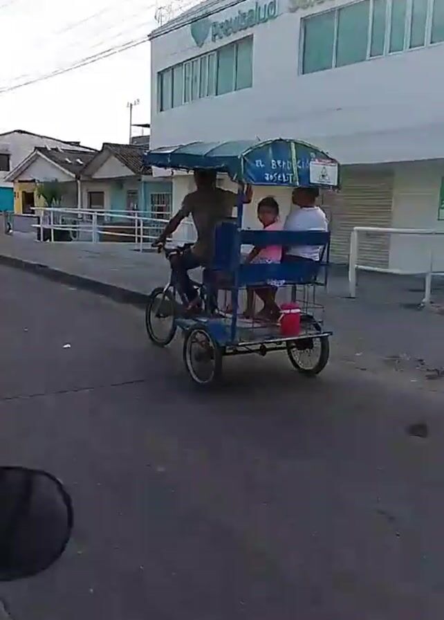 man riding a bicycle taxi with two passengers, including a child. The taxi has a blue canopy and the words "El Benitez" painted on it. The taxi is being driven on a paved road past a hospital building. The camera follows the taxi from another moving vehicle. The video also shows a series of small houses painted in various colors.