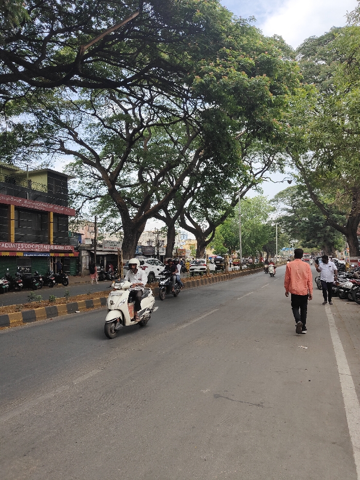 street in Mysuru, India. The street is lined with large trees on both sides, creating a canopy over the road. There are several people walking and driving on the street. One man is walking on the sidewalk and another man is driving a white scooter. There are cars and motorcycles parked on the side of the road. In the background, there are buildings and other trees. The scene is a typical street scene in Mysuru, with a mix of old and new buildings, and a lot of greenery. The coordinates (12.302, 76.65) indicate that the image was taken near the center of Mysuru, on a street called Sayyaji Rao Road. The road is paved with grey asphalt and has white lines separating the lanes of traffic. There are yellow curb lines along the edge of the road. The street is relatively empty of traffic. The day is overcast and the sky is a light blue. There are a few light posts visible along the road, and a small sign on the side of the street says "Graduates Co-operative Bank Ltd." The road is a mix of old and new buildings. There are also a few signs in Kannada, the official language of the state of Karnataka, India. There are also a few vehicles parked along the side of the road, including an auto rickshaw, a white car, and a blue car. The road is also lined with small plants and flowers.
