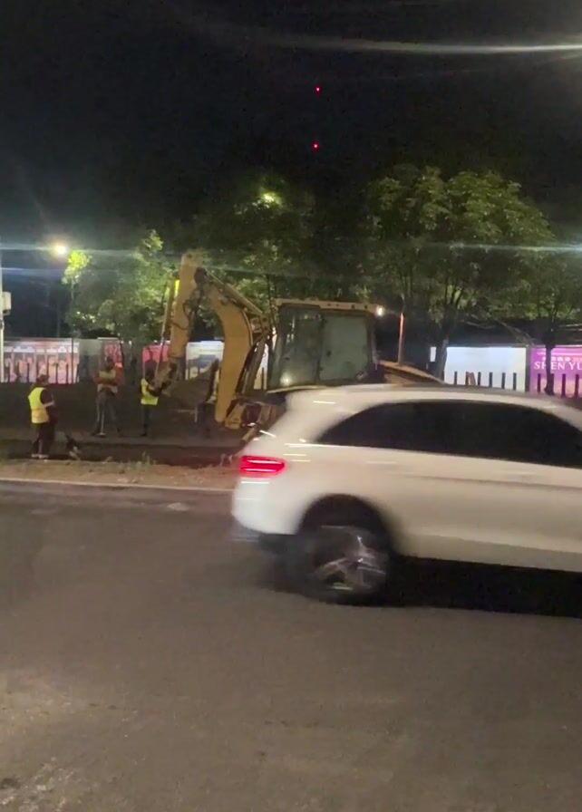 At night, a yellow backhoe sits on the side of a road, partially on a dirt bank and partially on the paved area. There are three people wearing bright yellow vests standing nearby, seemingly working on something near the machine. Cars pass by on the road in front of the backhoe. Streetlights illuminate the scene, and trees are visible in the background. There are also some signs with writing on them.