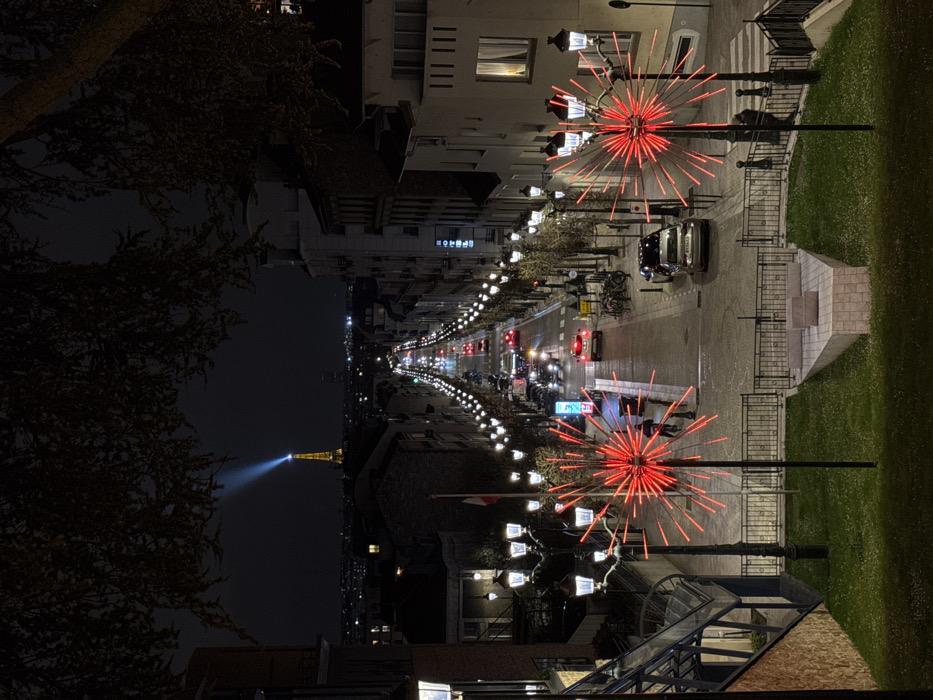 The image depicts a nighttime urban scene in Puteaux, France, looking eastward down an illuminated street, likely Rue Jean Jaurès, towards the distant Eiffel Tower in Paris. In the immediate foreground, a grassy slope is visible, featuring two prominent red, spiky, starburst-shaped light installations mounted on black poles. Between these lights, a small, angular concrete structure with a flat top is situated. A black metal railing separates this elevated grassy area from the street below. To the left, a pedestrian staircase with blue railings descends. Dark tree branches frame the top portion of the image. The midground presents a multi-lane asphalt road, receding into the distance. It is bordered on both sides by ornate, multi-bulb lampposts that cast warm light onto the street and sidewalks. Numerous vehicles are present: several cars are parked along both curbs, while others are in motion along the street, identifiable by their illuminated headlights and taillights. A few indistinct human figures are visible on the sidewalks. Bicycles are parked on racks on the right sidewalk. Buildings, predominantly multi-story residential or commercial structures with lighted windows, line both sides of the street. A French flag on a flagpole is visible on the left side of the street. The background reveals a panoramic view of the distant Paris skyline under a dark night sky. The Eiffel Tower stands centrally, fully illuminated, and emits a powerful, sweeping white searchlight beam from its apex. Other city lights dot the distant horizon.