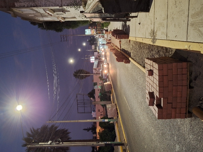 street in Socabaya, Peru (latitude: -16.459, longitude: -71.545), at night. The street is paved and illuminated by streetlights. There are a few cars parked along the street. There is a pile of red bricks stacked on a wooden pallet on the right side of the street. The sidewalk is made of concrete and there are some plants growing on the side of the street. A large building is on the right side of the image. A few power lines cross the image from left to right. The sky is dark blue with a bright, white, round, streetlight shining in the center of the image. There is a palm tree and a few other small trees in the background. The area appears to be under construction.