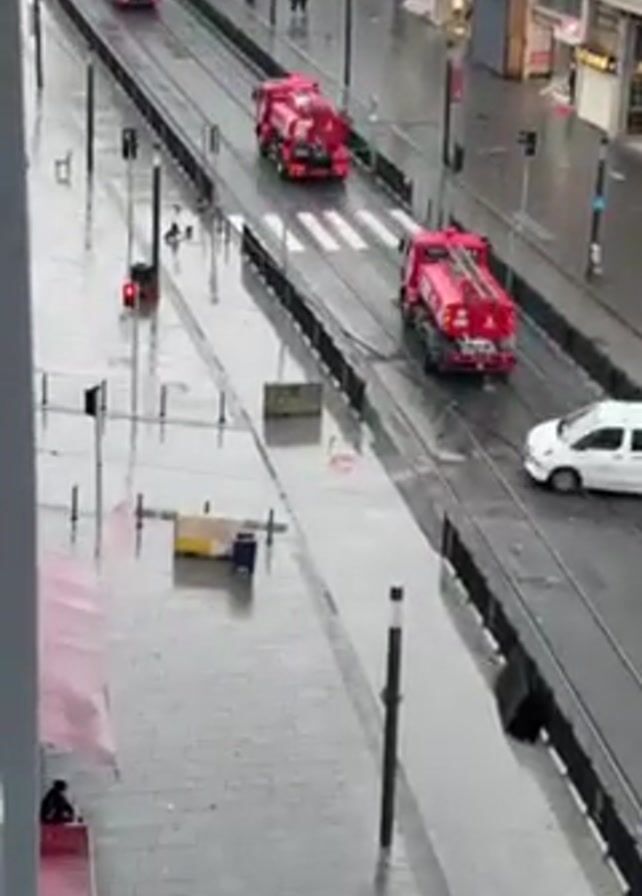 street scene in a city on a rainy day. Three red fire trucks are driving in the same direction, one following the other, in the lanes of a tramway. A white van is on the other side of the median. The street appears wet. The street is lined with buildings and there are pedestrians walking on the sidewalks. The siren of an emergency vehicle can be heard.