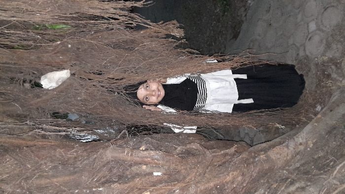 A person with a headscarf, dressed in black and white, lies nestled within the exposed roots of a large tree. The intricate network of roots surrounds the individual, creating a sense of enclosure. The lighting is dim, adding to the mysterious ambiance of the scene. Patches of gray concrete are visible in the background.