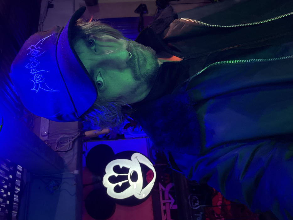 A man with blonde hair and a slight beard, wearing a black cap and jacket, faces the camera. He has a piercing in his nose. The background is an eclectic mix, illuminated by blue and green light. A Mickey Mouse graphic is prominently displayed, while graffiti and electrical wiring are visible in the periphery. The overall scene has a slightly disorienting, edgy vibe.