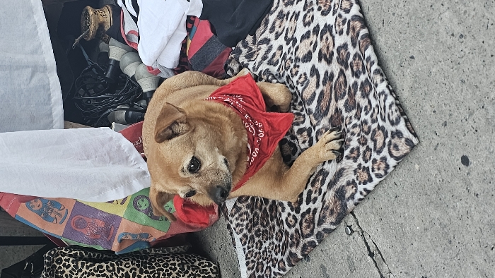A medium-sized, light brown dog wearing a red bandana lies among assorted items. The dog is positioned on a leopard print blanket which partially extends onto the gray concrete surface. The dog is lying in a heap of clothing and other objects, including white garments, a multicolored patterned bag, and assorted items hinting at a sale or relocation.