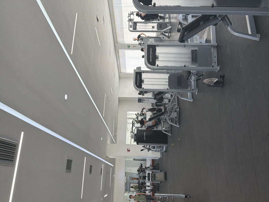 The image depicts a gym with various exercise machines arranged in rows. Some individuals are using the equipment. The machines include Hammer Strength and Life Fitness brands. The flooring is dark gray rubber. The ceiling is white with integrated linear lighting. There are windows at the end of each row. An air vent is visible on the wall.