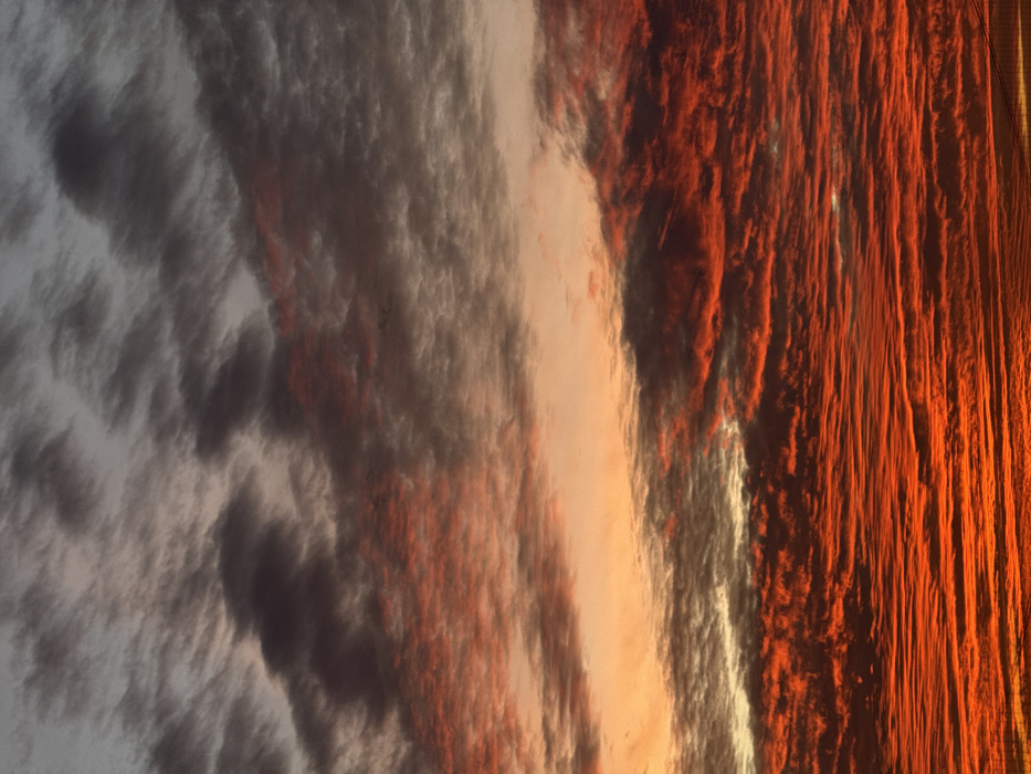 A vibrant, abstract sky scene unfolds, featuring intense colors and dramatic cloud formations. The left side showcases muted gray and white clouds, transitioning into a fiery orange-red pattern on the right. A central band of bright white or yellowish light acts as a divider. The red section displays an almost textured appearance, with elongated streaks contributing to the overall dynamic effect.
