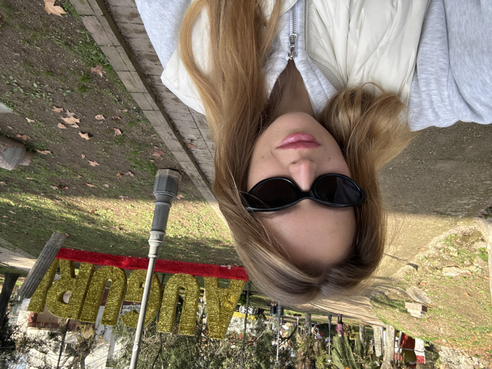 The image depicts a female subject taking a selfie in a public park in Anzio, Italy. The subject, positioned in the foreground, has long, light brown hair, wears black oval-shaped sunglasses, and has light pink lipstick applied. She is dressed in a light grey hooded sweatshirt beneath an off-white quilted vest with a zipped front. Her expression is neutral. In the mid-ground, to the subject's right, a large, three-dimensional sign spells "AUGURI!" in gold, glittery letters with red borders, mounted on a red base on a grassy slope. A grey, ornate street lamp post stands in front of this sign. The ground on the right consists of green grass with numerous scattered brown leaves. A paved pathway runs parallel to the grassy area on the right. To the subject's left, an unpaved dirt path ascends a hillside, bordered by a grassy slope, rocks, and various trees with both bare and evergreen foliage. A small, indistinct figure of another person is visible further up this path in the distance. The scene is illuminated by natural light, indicating an outdoor park environment.