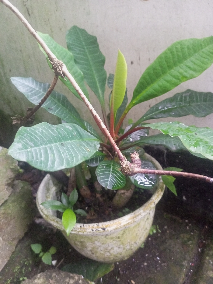 This image, taken in Zee Pin Kone, Myanmar, depicts a potted plant positioned outdoors against a light-colored wall. The main subject is a plant, likely a species of Euphorbia, characterized by thick, dark green leaves with distinct light-colored veins, and reddish-brown woody stems. A prominent new, light green leaf bud is emerging from the top center of the plant. Several water droplets are visible on the leaves, indicating recent watering or rainfall. The plant is contained within a weathered, light gray or off-white pot, which appears to be made of concrete or ceramic. The pot holds dark soil, from which a small, bright green seedling with two primary leaves is also growing at the base of the larger plant. The pot rests on uneven, dark ground, which includes visible soil, small patches of moss, and several rough, irregular stones. Additional small green sprouts are visible on the ground directly adjacent to the pot. Behind the plant, a light-colored, possibly concrete, wall with a somewhat textured or stained surface serves as the background. No people are present in the scene.
